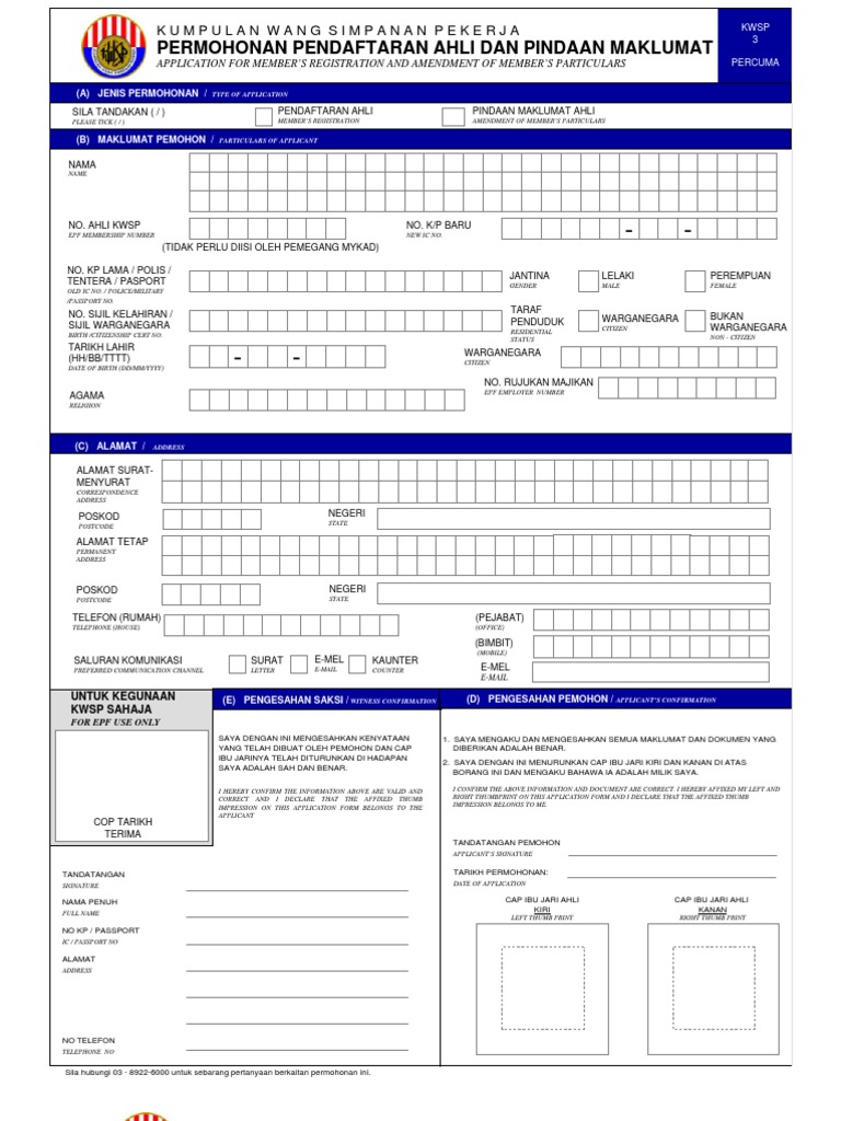 . Perkara-perkara yang perlu dilaksanakan dalam fasa ini ialah. 1 V04012022 Sila hubungi Pusat Pengurusan Perhubungan KWSP 03 8922 6000 untuk sebarang pertanyaan berkaitan permohonan ini. Majikan hendaklah meminta pekerja mengemukakan borang ini sekiranya pekerja pernah bekerja dengan majikan-majikan lain dalam tahun semasa.